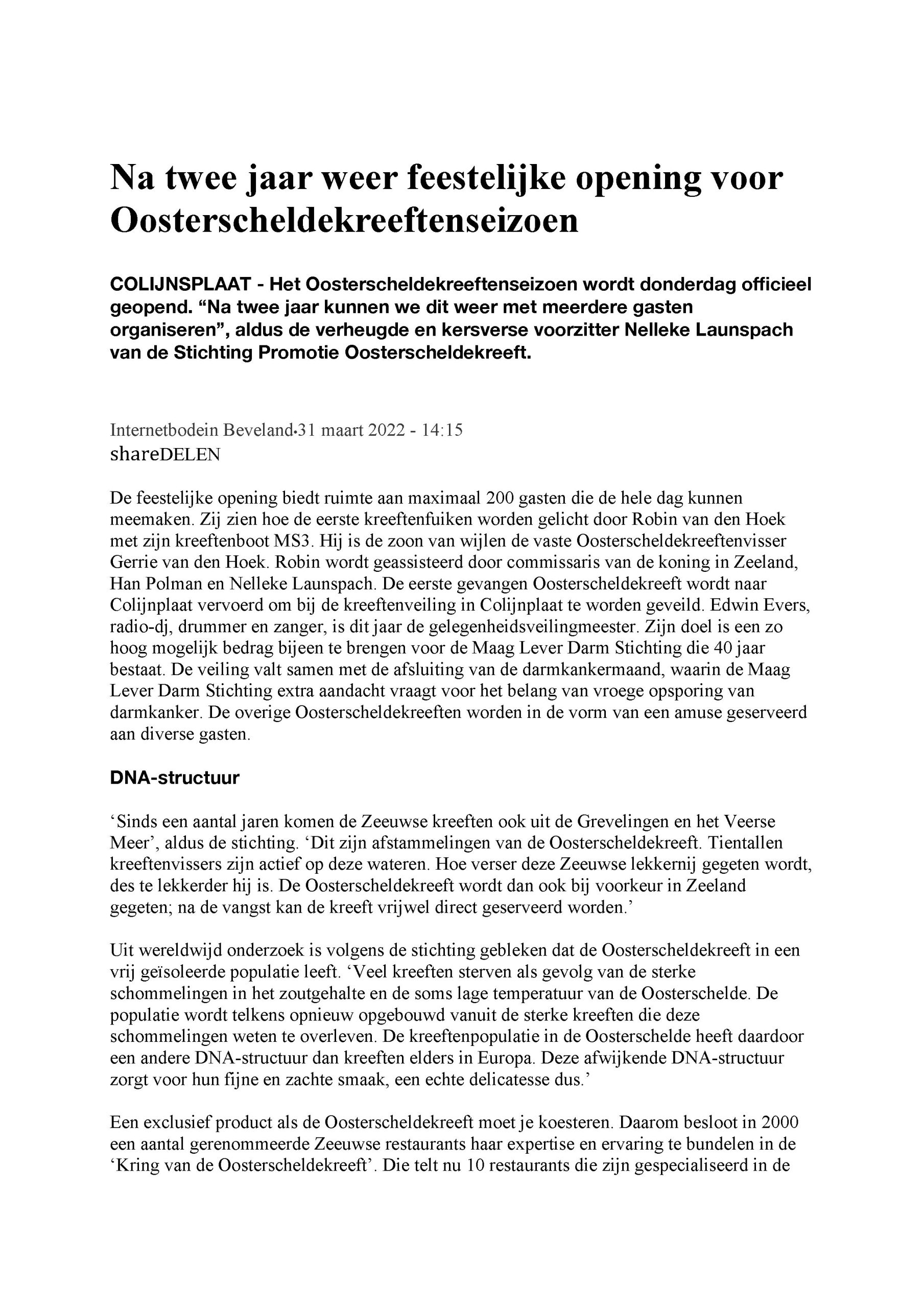 Zierikzee – De feestelijke opening van het Oosterscheldekreeftseizoen was dit jaar minder massaal maar niet minder feestelijk. Een kleine 200 gasten waren in de ochtend van donderdag 31 maart getuige van het binnenhalen van de eerste Oosterscheldekreeft van het seizoen 2022. Het kreeftenseizoen loopt elk jaar vanaf de laatste donderdag in maart tot en met 15 juli.